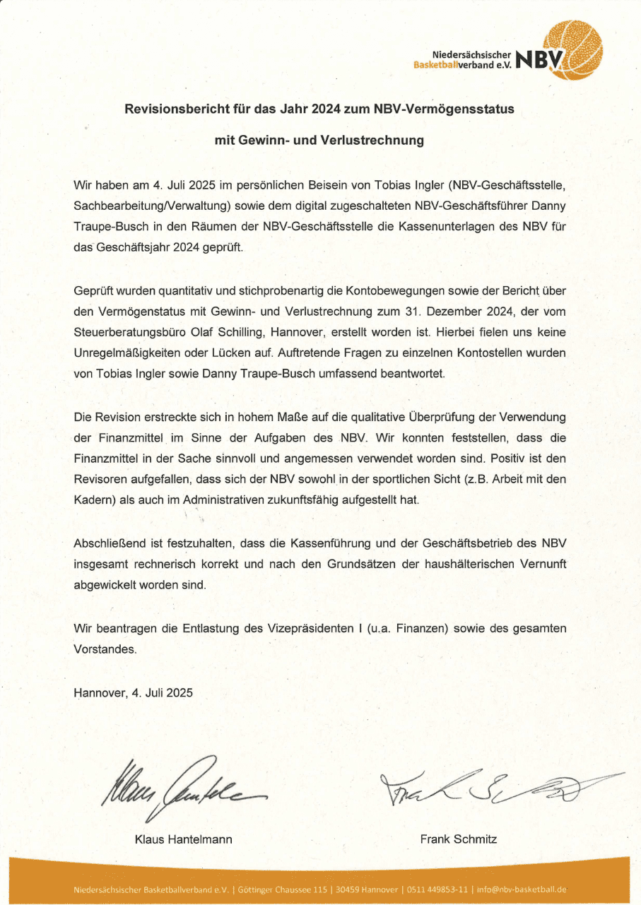 Wir haben am 4. Juli 2025 im persönlichen Beisein von Tobias Ingler (NBV-Geschäftsstelle, SachbearbeitungA/erwaltung) sowie dem digital zugeschalteten NBV-Geschäftsführer Danny Traupe-Busch in den Räumen der NBV-Geschäftsstelle die Kassenunterlagen des NBV für das Geschäftsjahr 2024 geprüft.